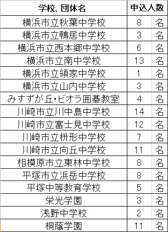 2025 神奈川県小中高校生囲碁段級位認定大会エントリー状況 投稿日時: 2025年9月19日 投稿者: 三浦弘生 9/28(日)開催の県小中高校生囲碁段級位認定大会で 団体申し込みの状況は画像の通りです。もしエントリーがなされてない場合は至急 hmiura@toin.ac.jp まで連絡願います。